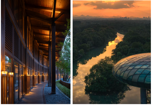 · 栖息于自然中,下榻于水岸上,一场与自然共鸣的「璟界」栖居体验开启。客房整体轻盈延伸至水面,西溪流水与四时风光尽收眼底。私享大型室外露台设有席地茶台与水疗汤池,可佐西溪至美落日品琢精品茶艺,又可沉浸于暮色至静夜中温和汤池。愿您所在景色与时光皆缓慢松弛。